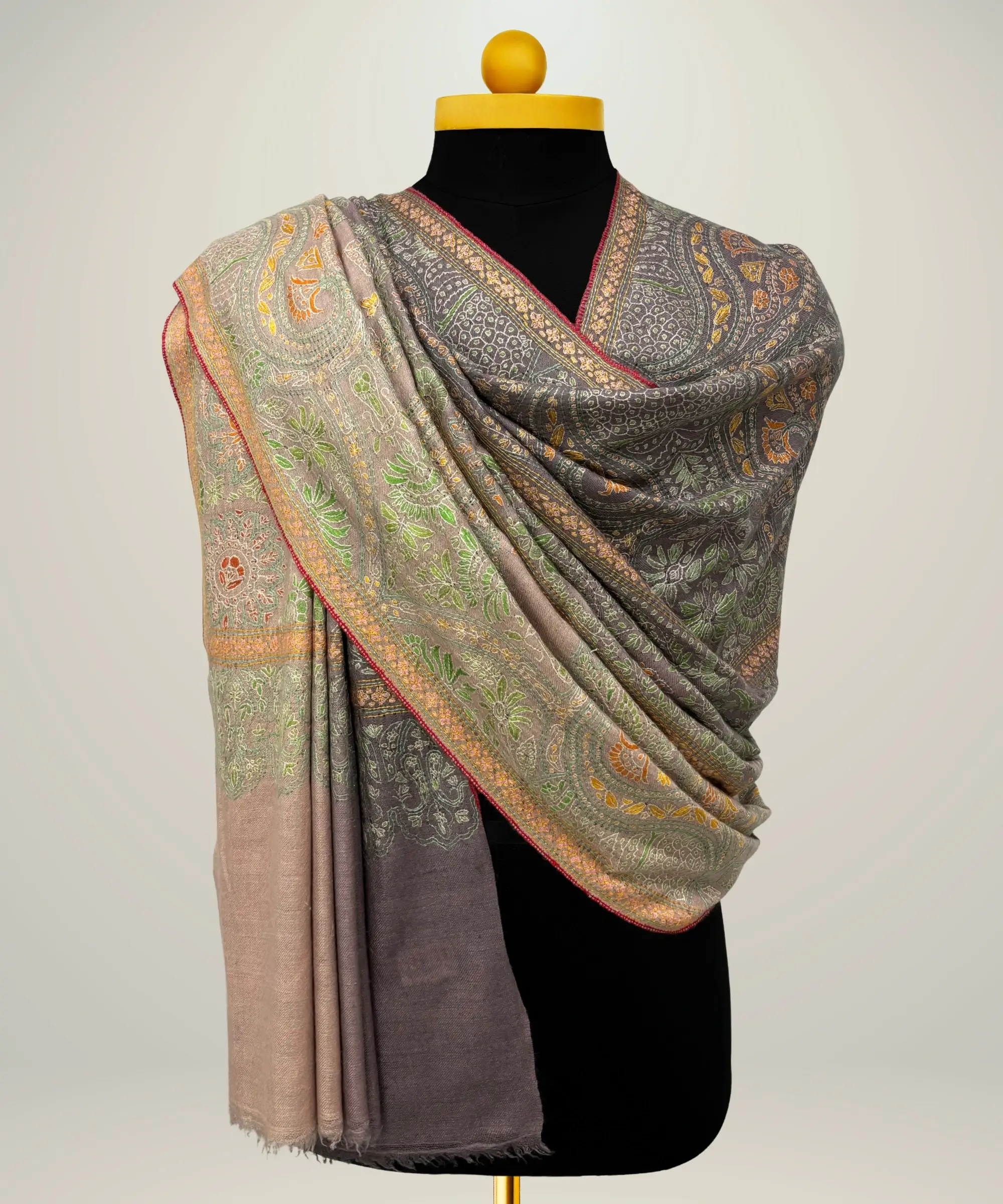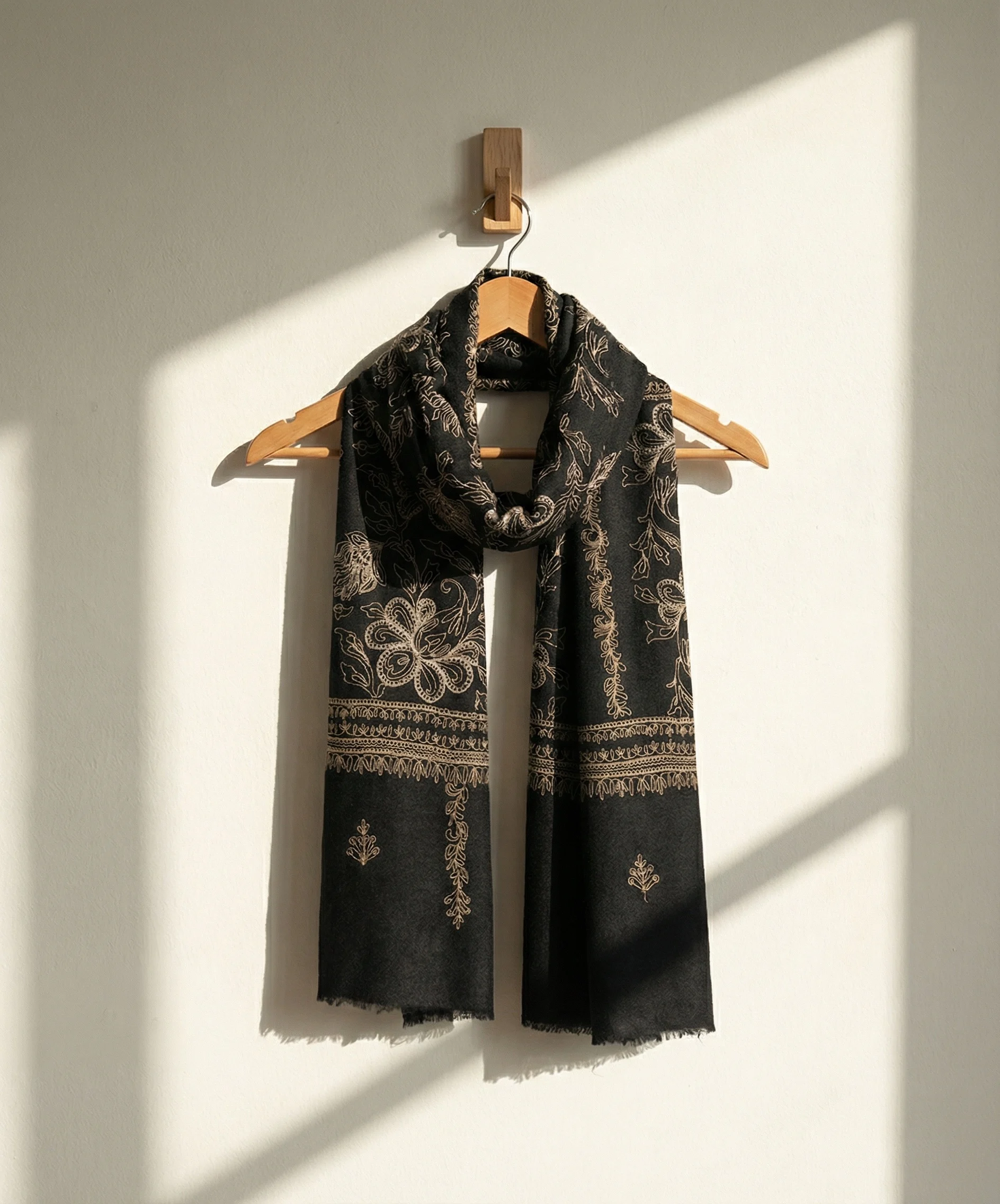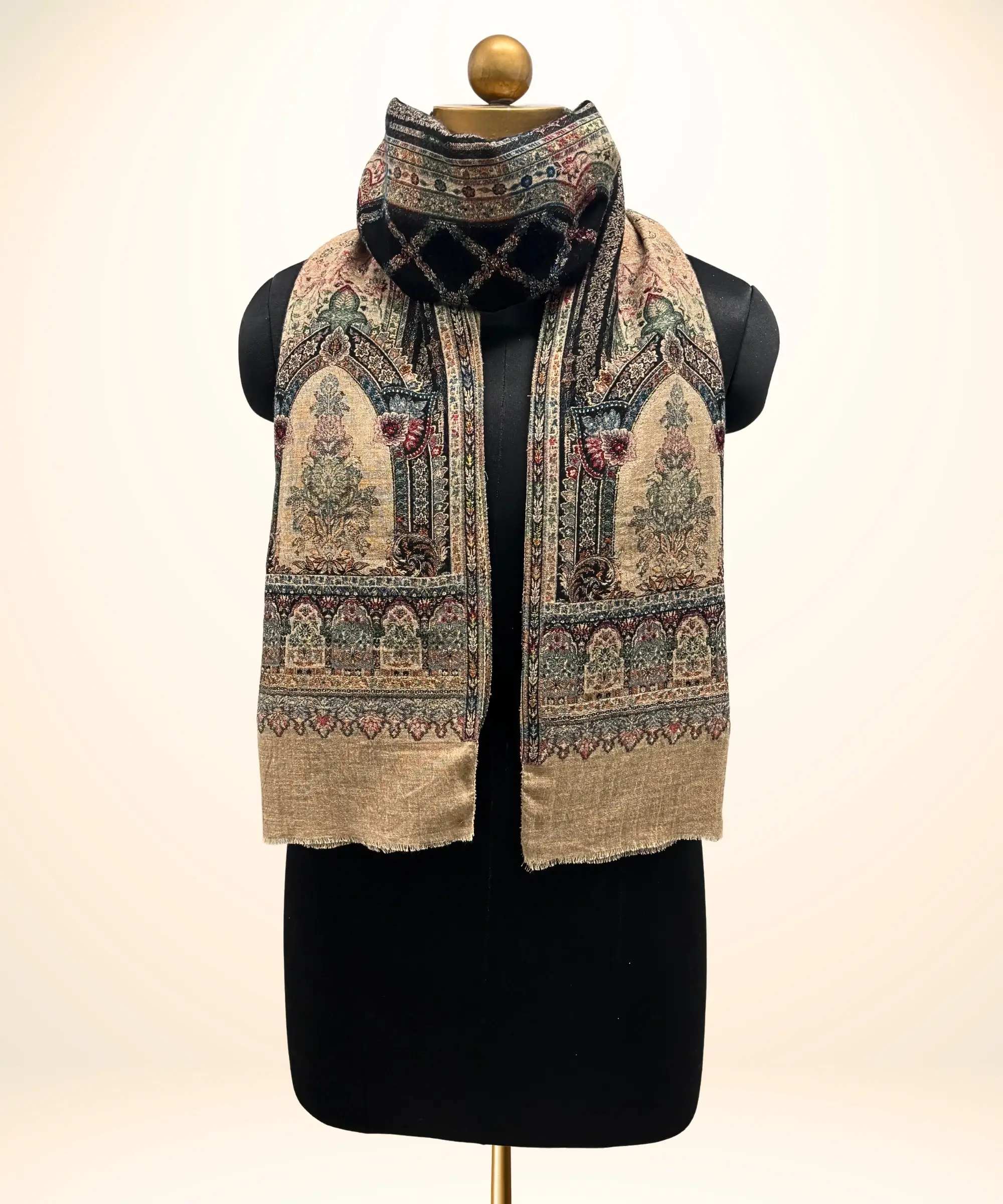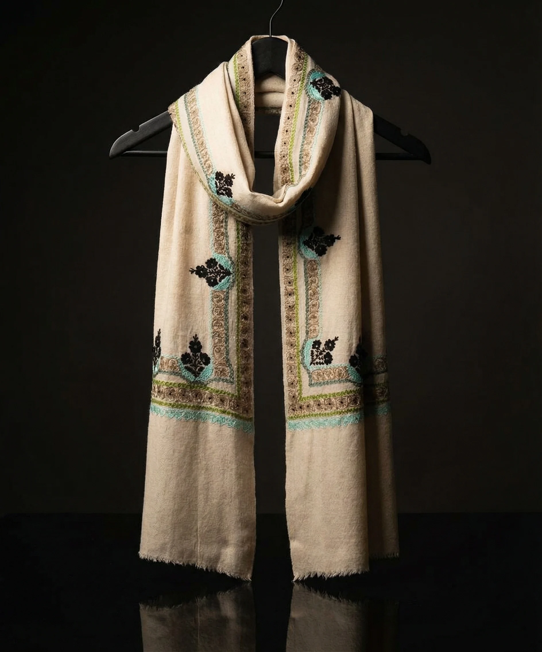 Beige and black Pashmina Cashmere Stole With Zari Embroaidery and Kani Weave