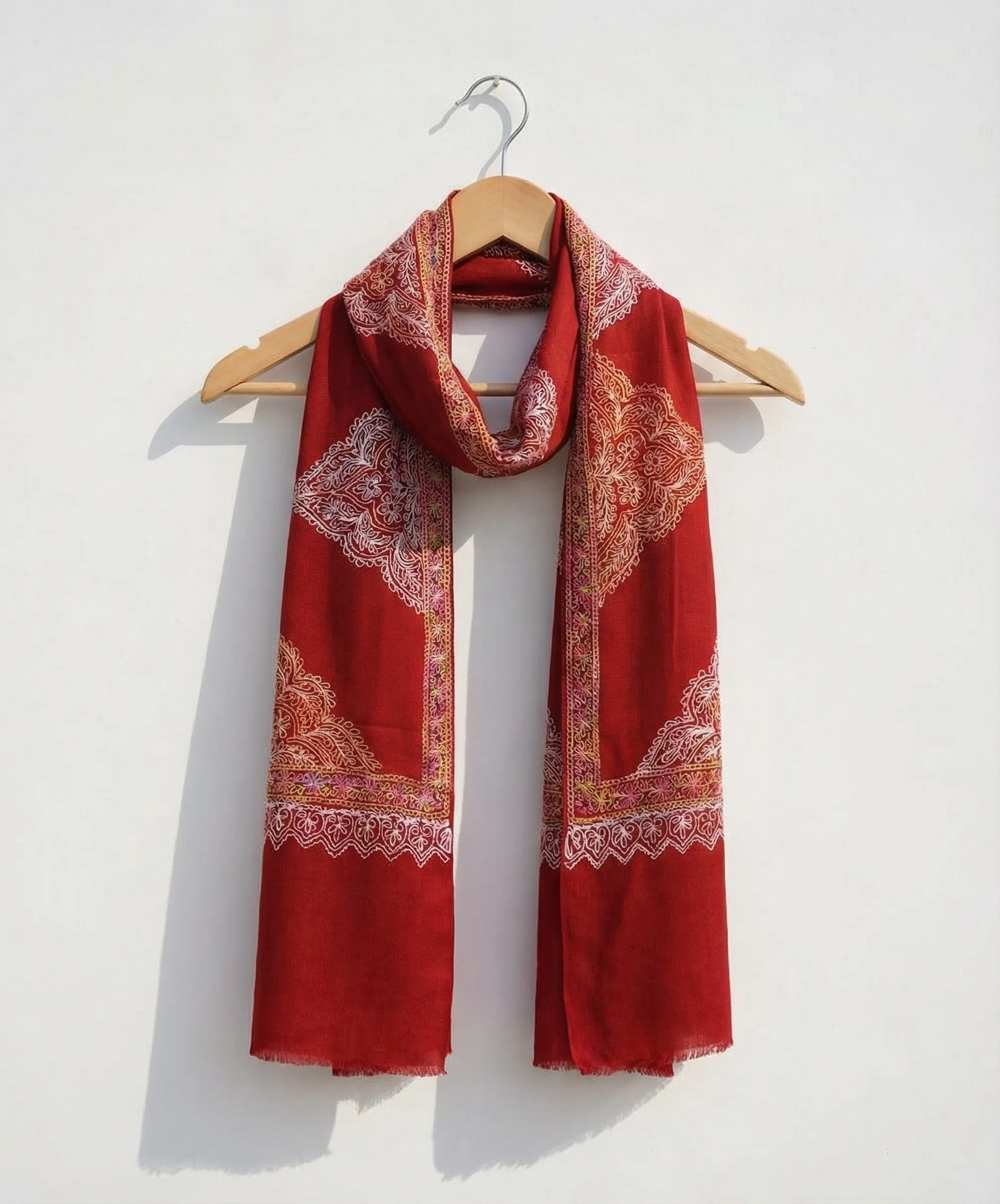 Handmade Red Pashmina Cashmere Stole With Floral Aari Embroidery