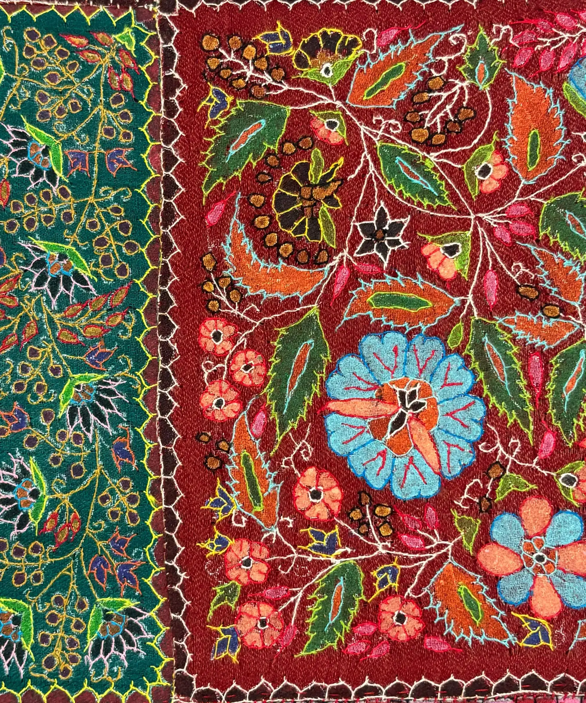 The patterns draw from Kalamkari, a traditional art form based on hand-drawn motifs. The term comes from “kalam” (pen) and “kari” (craft), and is known for its flowing, nature-inspired designs such as vines, florals, and paisleys. Here, these elements are translated into the weave rather than printed or embroidered.