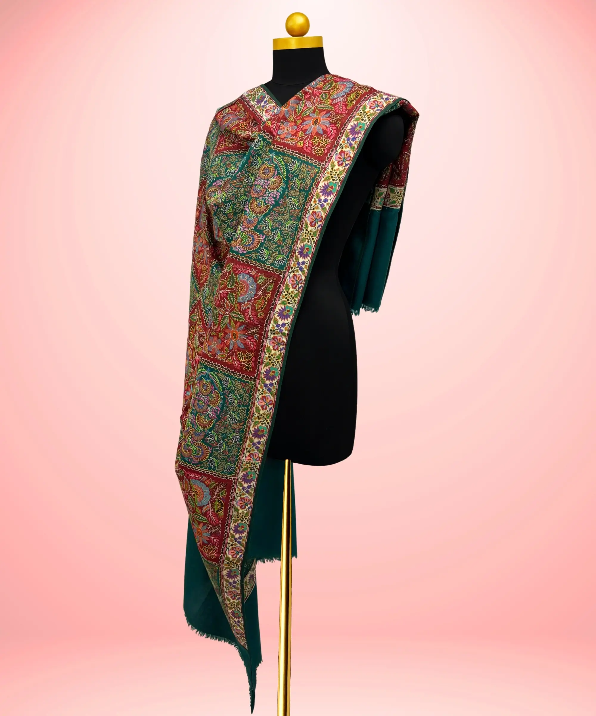 Handwoven in Kashmir from fine pashmina wool, this Kalamkari Jamawar shawl showcases intricate patterns formed directly within the weave. The Jamawar technique creates detailed paisleys and florals as part of the fabric itself, resulting in a seamless and durable design.