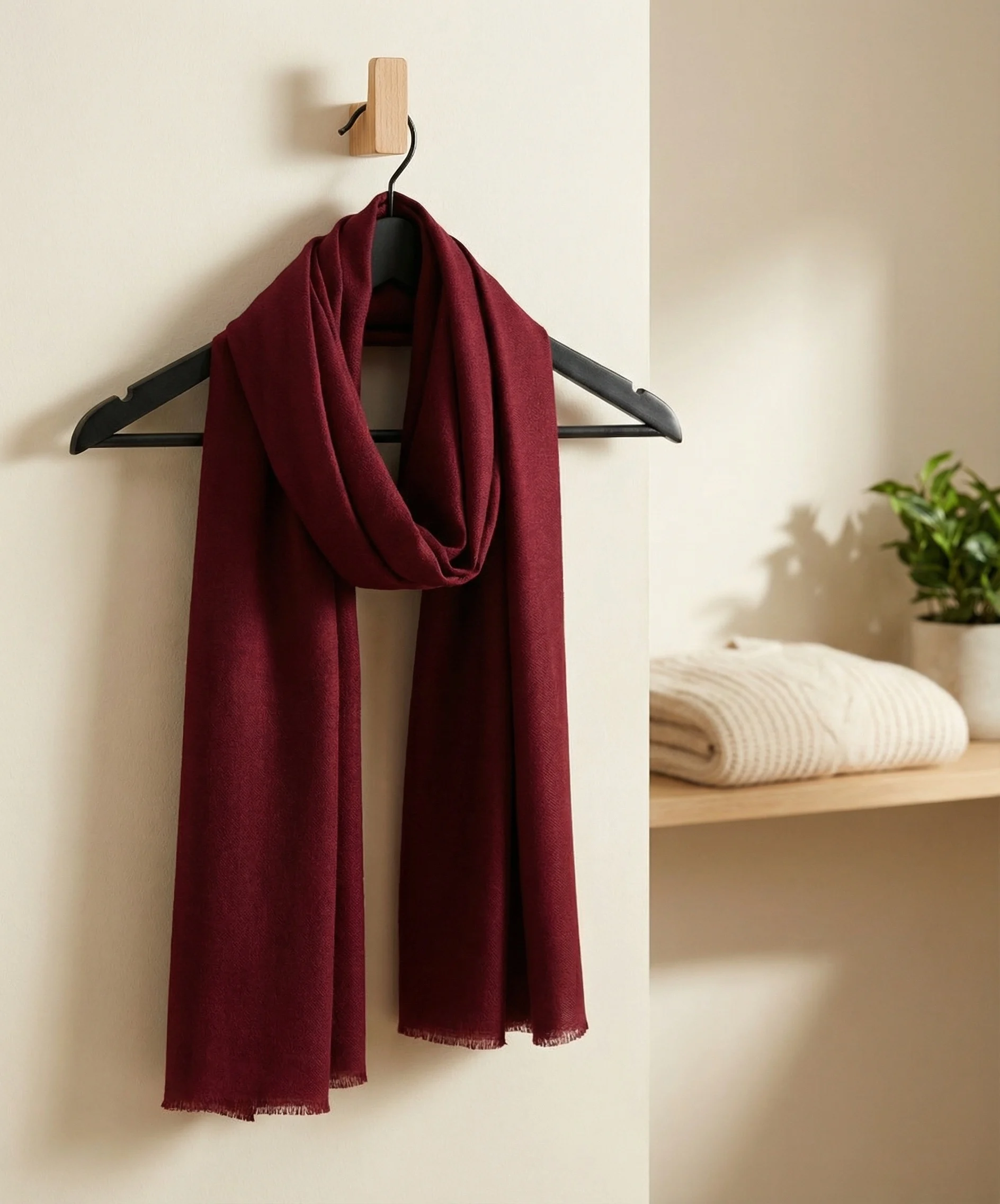 Handwoven on a traditional handloom from pure Pashmina, this plain crimson scarf celebrates the essence of Kashmiri craftsmanship in its most refined form. Free from ornamentation, the design allows the natural softness, warmth, and fluid drape of the fibre to speak for itself. The serene cream tone highlights the precision of the weave and the patience of the artisan, reflecting a tradition where true luxury is found in simplicity. Timeless and effortlessly elegant, this scarf is designed to transcend seasons, offering a quiet, enduring expression of authentic Pashmina heritage.