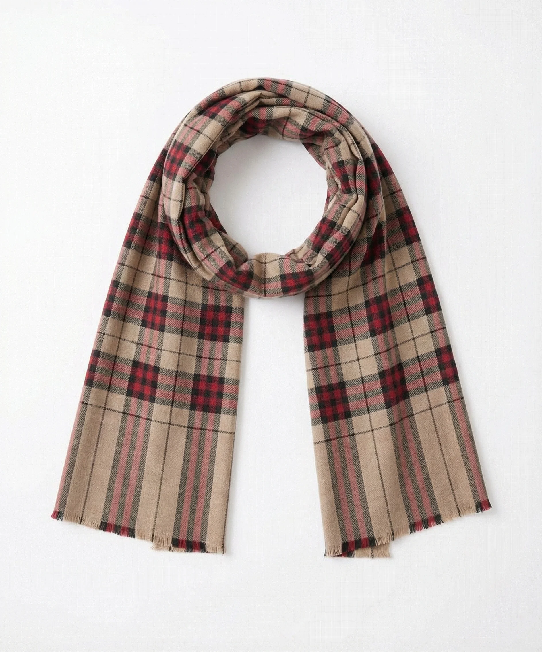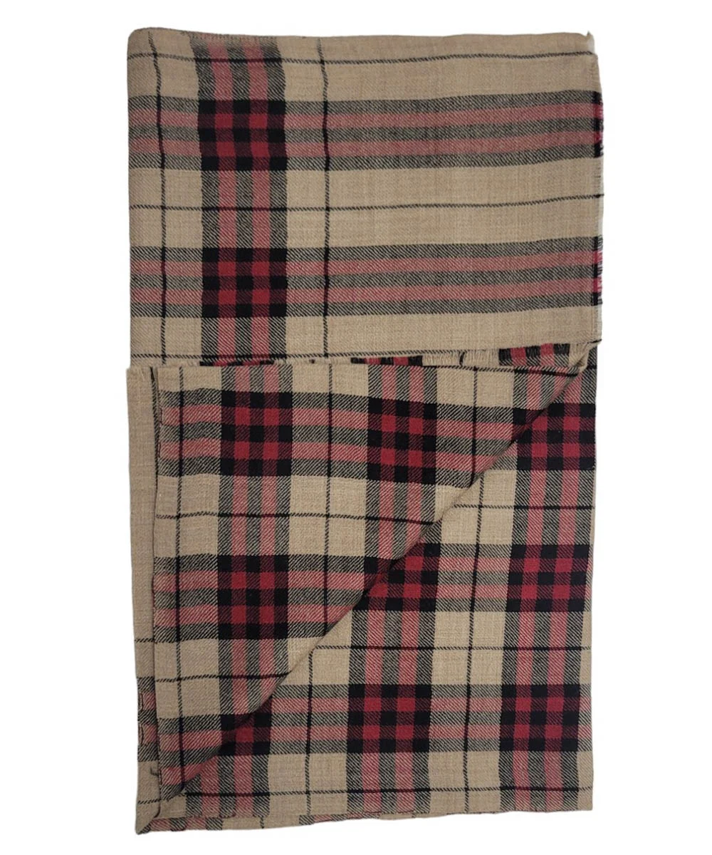 Handwoven on a traditional loom from pure Pashmina, this beige and red scarf features a classic tartan check that lends quiet structure and timeless character to its soft, airy base. The balanced pattern enhances the natural elegance of the fabric while preserving the exceptional softness, warmth, and fluid drape for which Pashmina is prized. Effortlessly versatile and refined, this scarf blends heritage design with contemporary ease, making it a thoughtful addition to both everyday and elevated wardrobes.