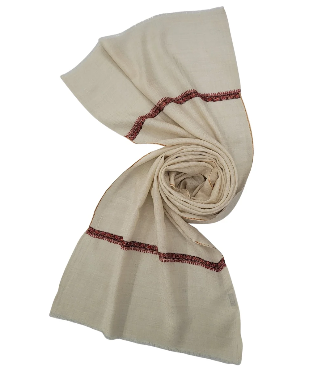 Made in Kashmir, India from pure Pashmina, this white scarf embodies the timeless Hashidar tradition, where elegance is defined by restraint and precision. Woven on a traditional handloom, it features a finely hand-embroidered border crafted in delicate needle work, framing a calm, unbroken centre that enhances its refined presence. Inspired by motifs once favoured by royalty, each stitch reflects generations of artisanal knowledge and quiet devotion to craft. Exceptionally soft, lightweight, and naturally warm, this scarf is a study in understated luxury, designed to endure beyond seasons and trends while carrying forward the living heritage of Kashmiri Pashmina.