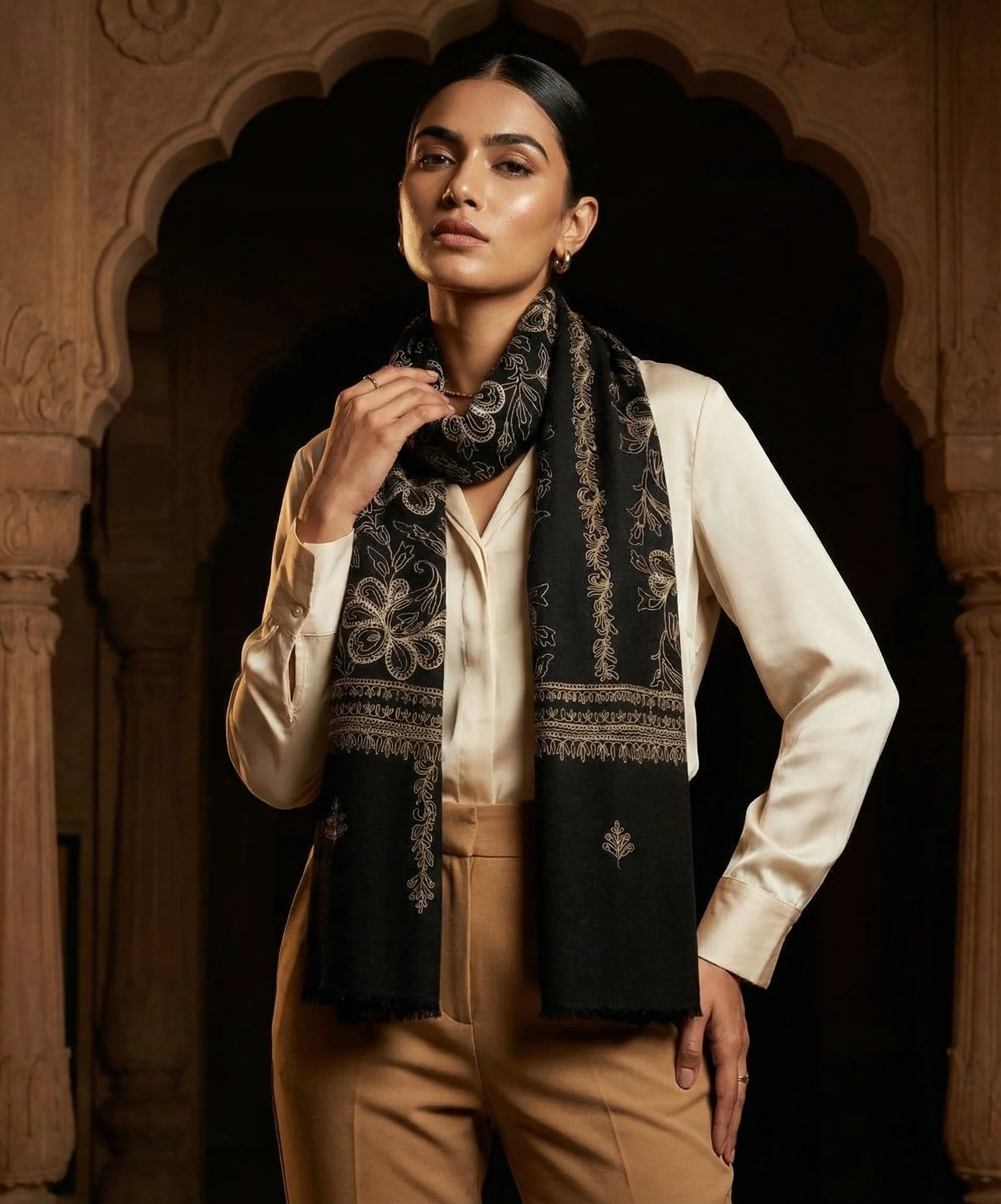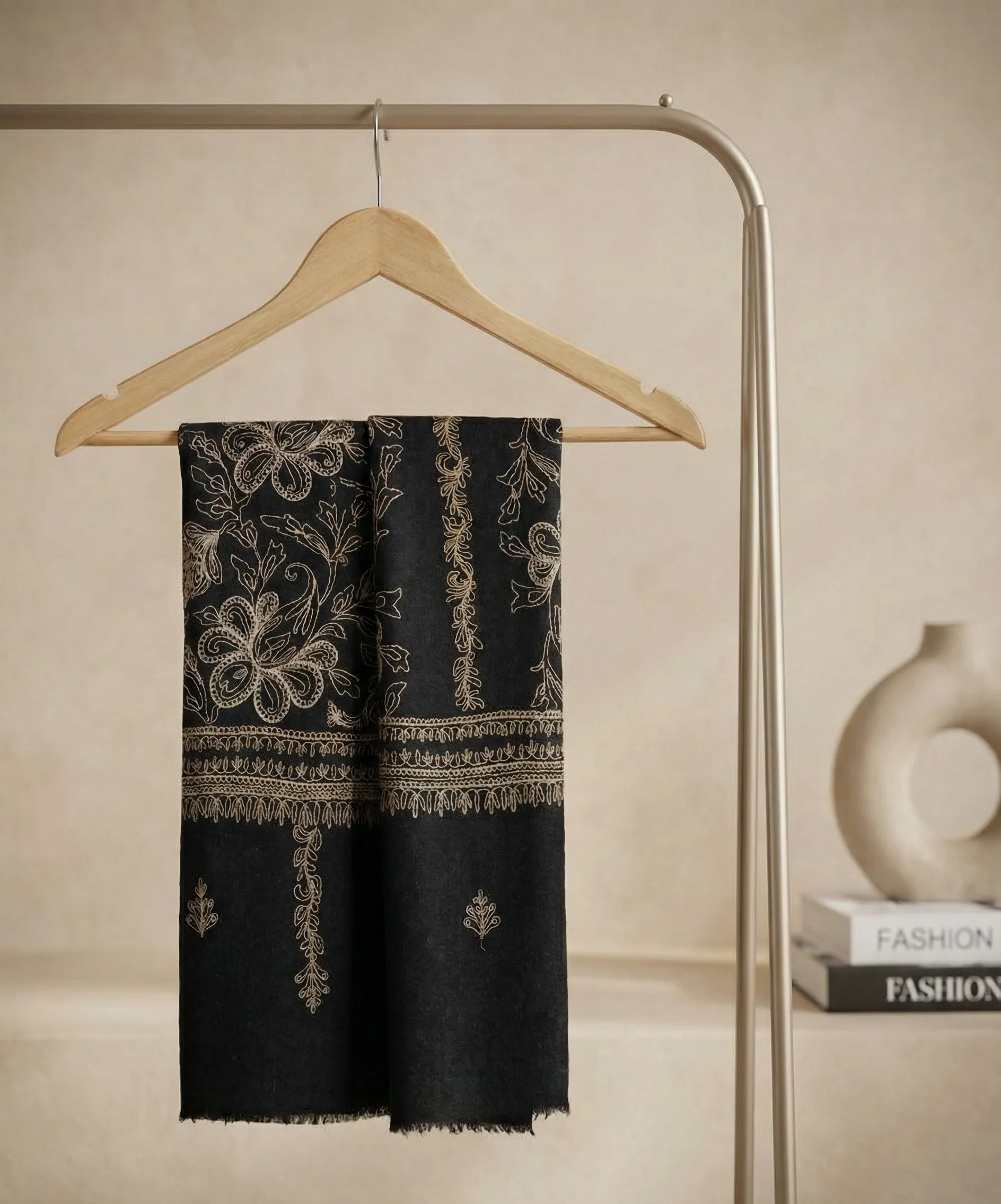 Elegant and versatile, this handloom Pashmina stole complements both formal attire and elevated everyday wear. It reflects the skill, patience, and artistic legacy of Kashmiri artisans who continue to uphold age-old weaving and embroidery traditions.